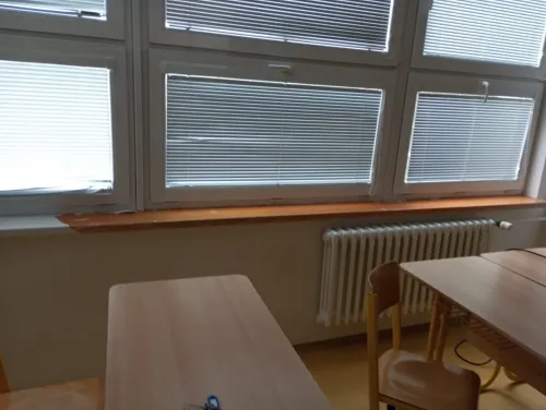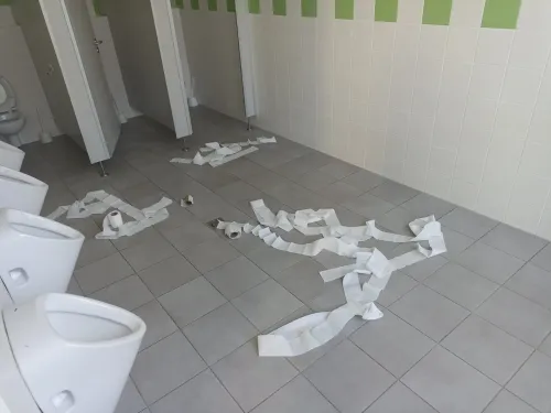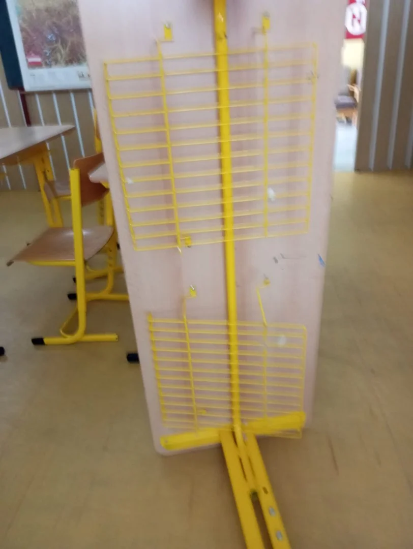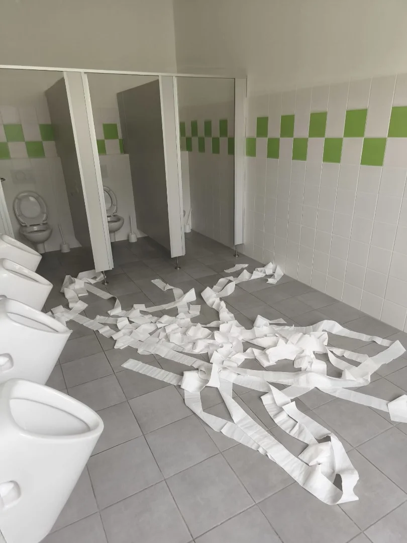 Rádi bychom se několika fotografiemi podělili i s vámi ostatními o to, s čím se v poslední době čím dál tím častěji setkáváme u nás ve škole. Je to různé poškozování zařízení – majetku školy, vlastně vandalismus. Zlomené kliky, ulomené termohlavice z radiátorů, po WC rozházený toaletní papír, různě zohýbané příbory v jídelně, po škole rozházené ovoce z obědů, utržené odkládací košíky z lavic, rozebraná světla v šatnách, sloupnuté fólie z parapetů, oloupaná omítka, vytržené gumové těsnění z oken na WC, rozbité okno a žaluzie, díry ve dveřích, ulámaná záchodová prkénka, o rytí a kreslení různých obrazců do desek lavic, či na stěny třídy, nebo vyhazování věcí (fixů na tabule) z oken ani nemluvě!?!